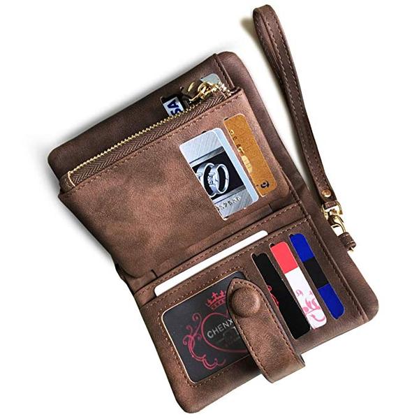 The wallet features RFID blocking that protects your data from electric pickpocketing or electronic scanners. It also comes in a compact design and has enough room to store multiple cards, cash, bills, and coins while keeping them well organized. The included durable metal zipper is better than most plastic zippers and not forgetting a wrist strap that enables to tag the bag along easily.